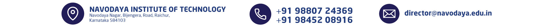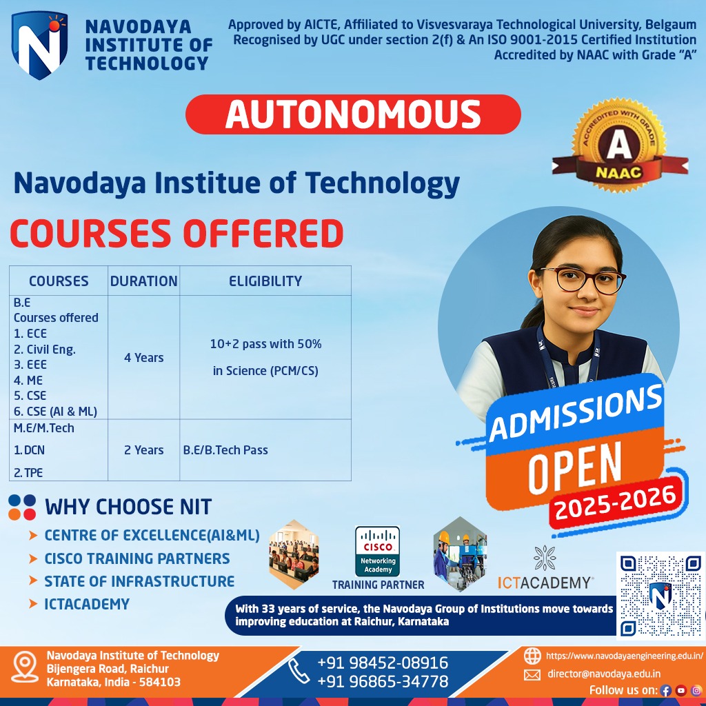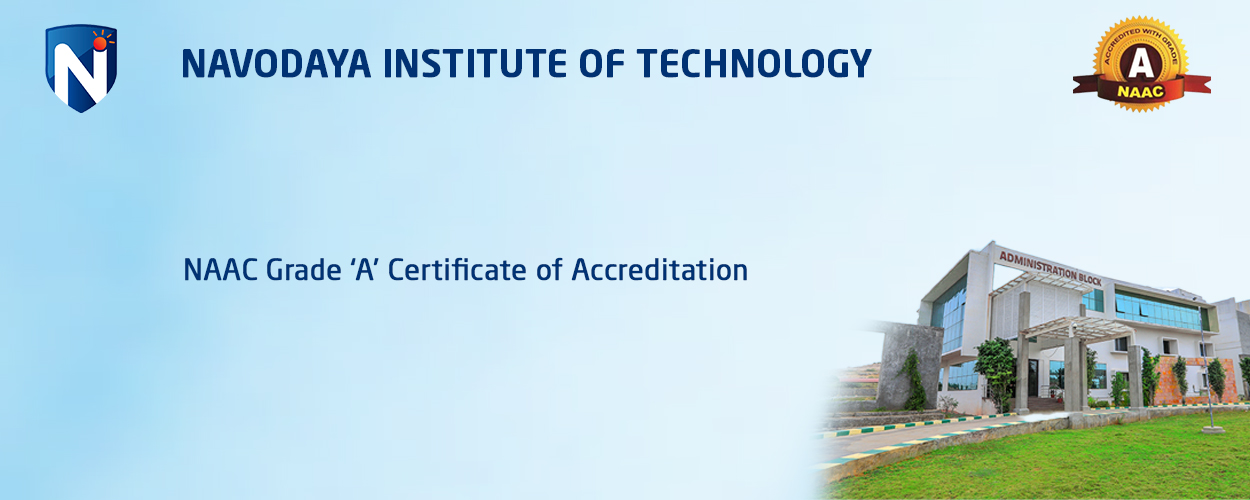 Navodaya Institute of Technology is affiliated to Vishveshvarayya Technological University (VTU), approved by All India Council for Technical Education (AICTE) & University Grants Commission (UGC). Aims to be the most respected institution of higher learning, renowned for excellence in Technology, NIT has been accredited by National Assessment and Accreditation Council (NAAC).
