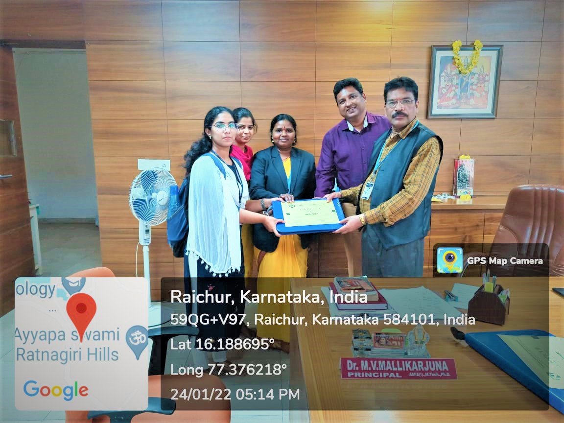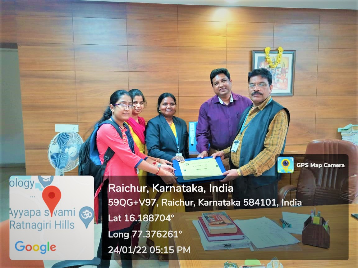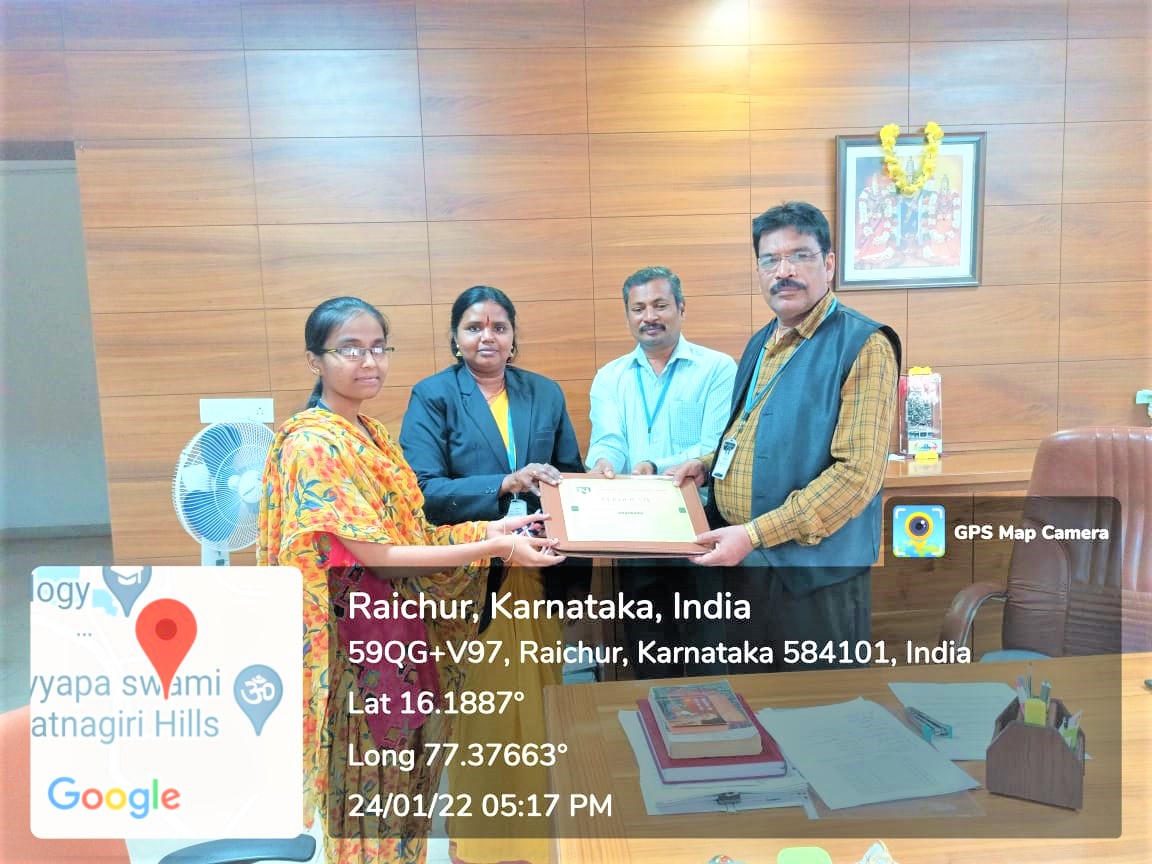 The Women Empowerment Cell of Navodaya Institute of Technology felicitated the merit girl students of all the departments on 24th January 2022 on account of National Girl Child Day as per the directions of AICTE, New Delhi. The Merit Girl Students are Ms.Parimala and Ms.Lavanya from Civil, Ms.Nida Afreen and Ms.Rithika Sharma from CSE, Ms.Reshma Begum and Ms.Meghana D from ECE, Ms.Fouziya Farheen and Ms.Aradhana from EEE.