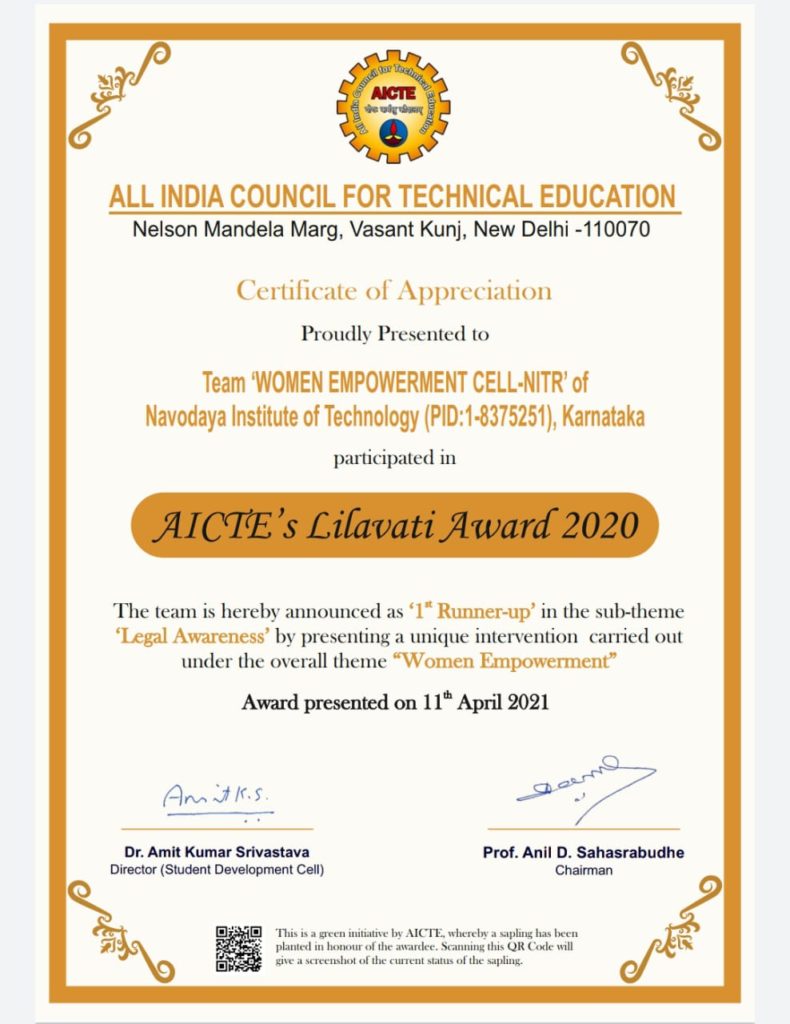 Navodaya Institute of Technology’s Women Empowerment Cell was awarded the AICTE’s Lilavati Award-2020,