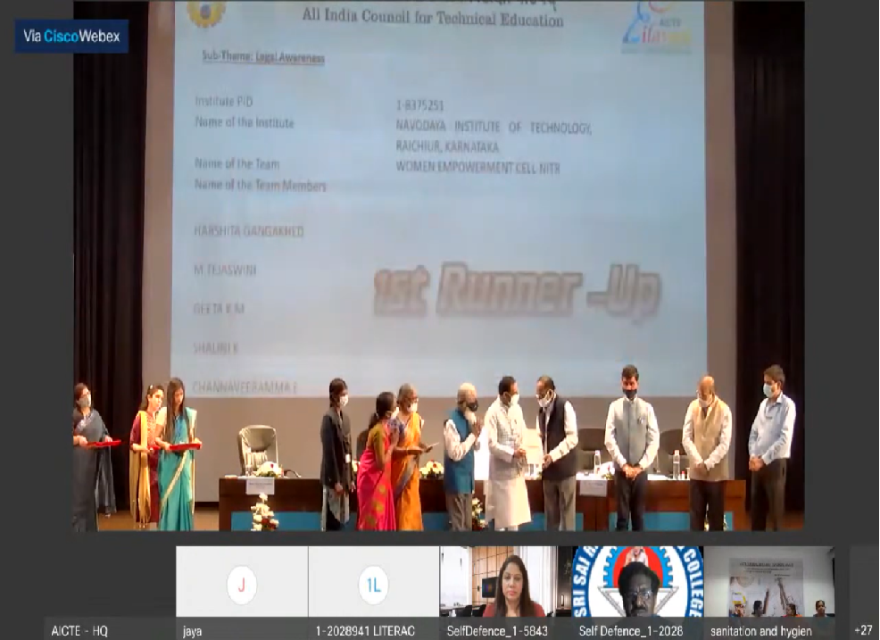 The Women Empowerment Cell of Navodaya Institute of Technology had enrolled under the sub theme Legal Awareness in December 2020 along with the events carried out summary and a short video. The Women Empowerment Cell-NITR team leader Mrs. Channaveeramma.E, Assistant Professor, Department of ECE presented the work carried out by team before the selection committee on 9th March 2021.