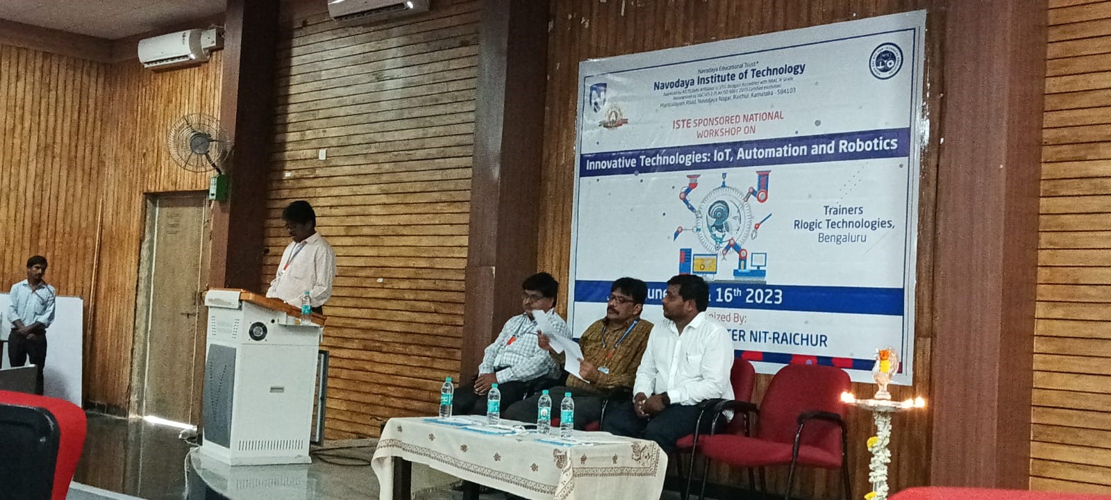 Navodaya Institute of Technology, ISTE Student Chapter, Raichur organized two days National Hands-on-workshop on “Innovative Technologies: IoT, Automation and Robotics” on 15th and 16th June 2023. Er. Rakesh and team at Rlogic Tecnologies Pvt Ltd, Bengaluru conducted this workshop. Principal Dr. M.V. Mallikarjuna presided over the function and delivered the presidential address. Dr. K.Venkatachalam, HOD/ECE, Student advisor, ISTE student chapter welcomed all the dignitaries and students. 125 students were participated and gathered practical knowledge of IOT and Robotics.